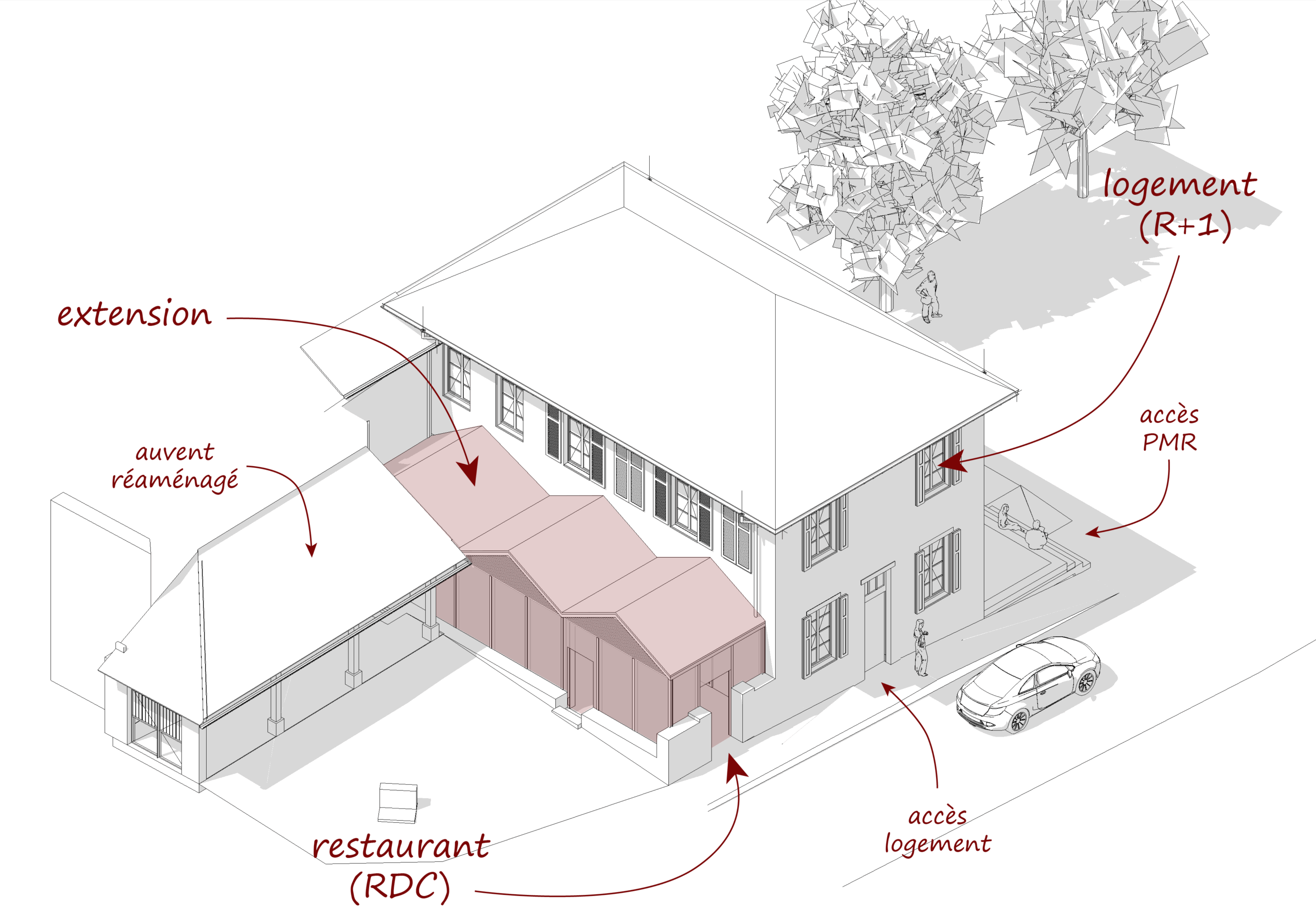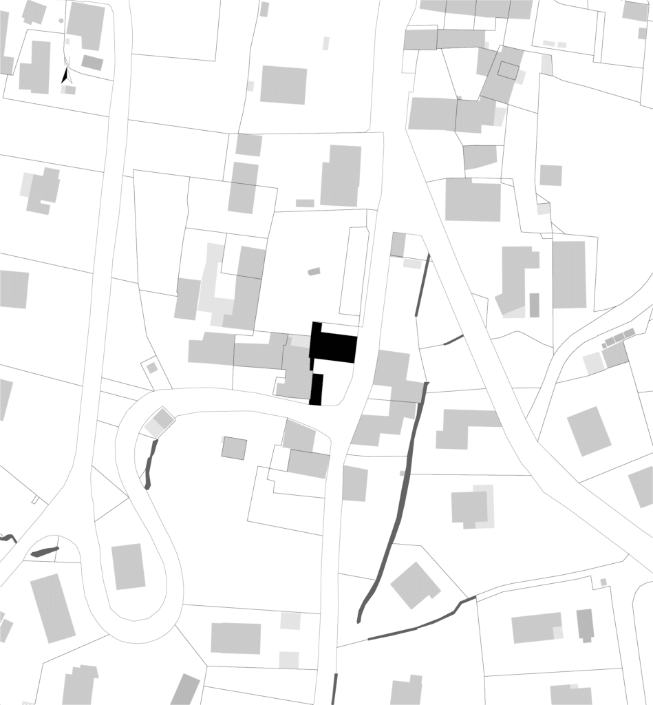 Dialogue entre ancien et nouveau, échelles urbaine et architecturale. Le bâtiment est mis en lien avec le cœur du village, 3 hypothèses de reconversion possibles, de la moindre intervention à la construction d’une extension.